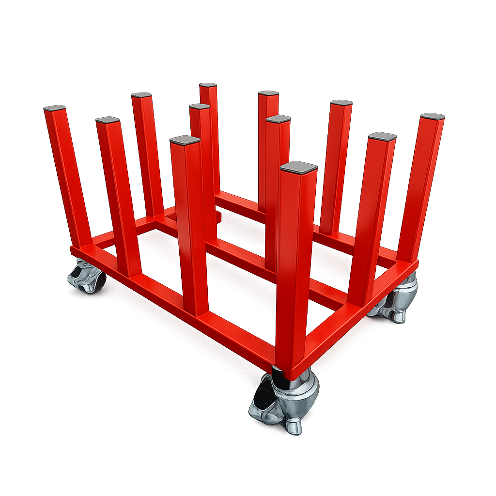 En primer lugar, es un bastidor móvil, pensado para almacenar bobinas de material gráfico en posición vertical y con el mínimo espacio, además gracias a sus ruedas con bloqueo podrás inmovilizarlo o utilizarlo como transporte.