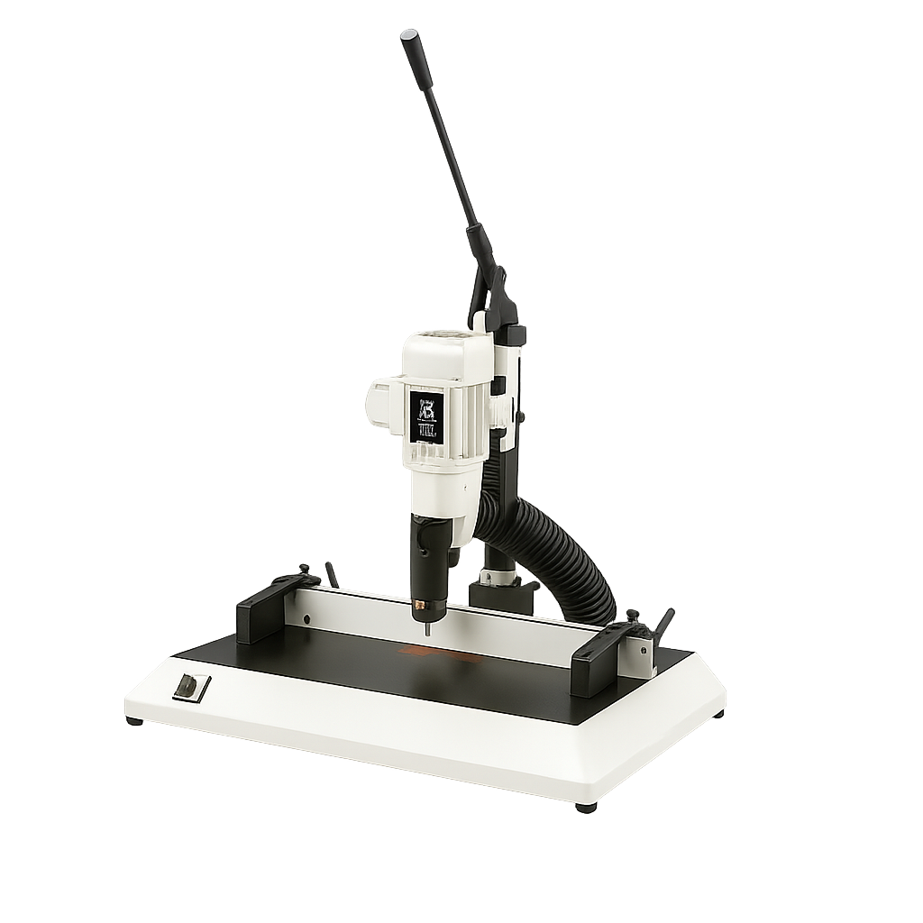Taladro de mesa eléctrica hacer agujeros redondos para fabricantes de catálogos, folletos, etiquetas de ropa, archivadores y muchos otros. Viene con una base para colocar sobre una mesa, un porta brocas con sistema de refrigeración para la broca, mesa de trabajo con medidas micrométricas para ajuste fácil de formarte y topes de perforación.